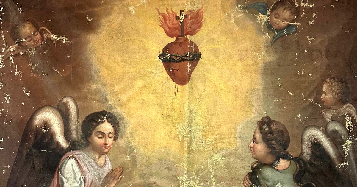 Il s’agit de deux anges adorant le sacré cœur. L’œuvre n’est pas signée. Elle semblerait daté du milieu du XIXe siècle. Nous pouvons la redécouvrir sur la photographie prise par Henri Deneux en 1912. Pliée en 4, son état est assez détériorée mais une restauration est possible. Nous avons engagé une étude auprès de l’Atelier Tüchlein à Villeurbanne. Un devis préliminaire nous a été transmis. Une suite sera donnée !